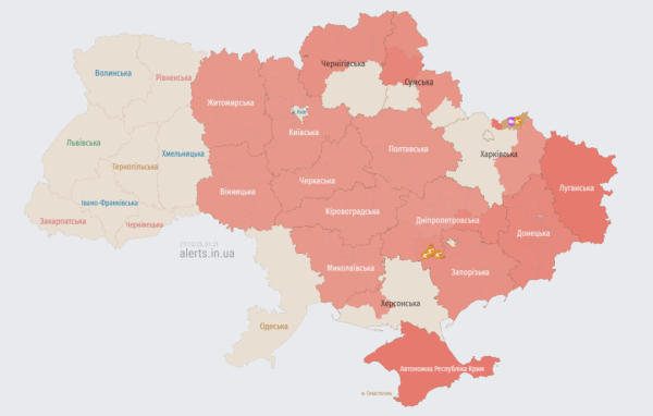 Поточна карта повітряних тривог по Україні на 01:21 / Джерело: https://alerts.in.ua/