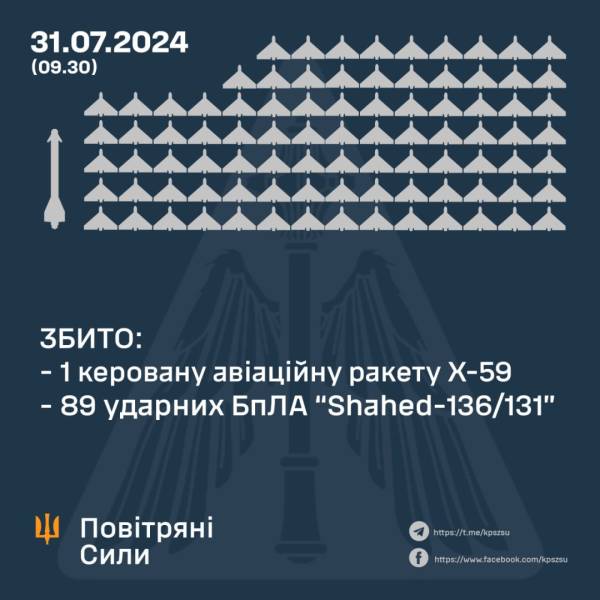 У ніч на 31 липня ворог атакував керованою авіаційною ракетою Х-59 із повітряного простору окупованої Херсонщини та 89 ударними БпЛА типу Shahed із районів Єйськ, Сеща, Курськ, Приморсько-Ахтарськ. Основний напрямок удару – Київська область.