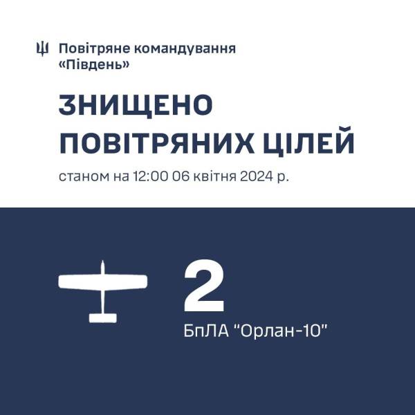 “Вдень 6 квітня 2024 року на Одещині, над акваторією Чорного моря, воїнами зенітної ракетної Одеської бригади знищено 2 російські розвідувальні БПЛА “Орлан-10”, – ідеться у повідомленні.