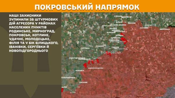 На Покровському напрямку Сили оборони зупинили 38 штурмових акцій ворога у районах населених пунктів Родинське, Мирноград, Покровськ, Котлине, Удачне, Молодецьке, Філія та у напрямку Білицького, Іванівки, Сергіївки й Новопідгороднього.