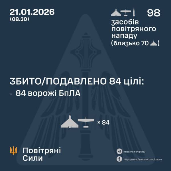 За попередніми даними, станом на 08:30 середи, 21 січня, ППО збила / придушила 84 безпілотники на півночі, півдні та сході країни.