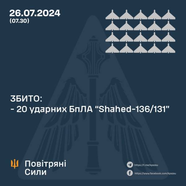 20 з них збила ППО у Херсонській, Сумській, Житомирській та Чернігівській областях.