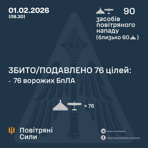 ППО з вечора знешкодила 76 зі 90 російських дронів 01.02.2026 09:01 Укрінформ Системи протиповітряної оборони нейтралізували 76 безпілотників, котрі російська армія застосувала для атак на Україну з вечірнього часу 31 січня. Зафіксовано попадання 14 ударних БпЛА на 9 об’єктах.