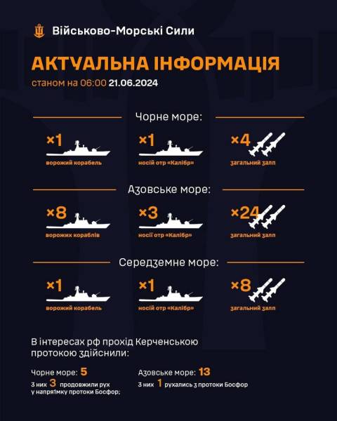 «В Чорному морі 1 ворожий корабель, який є носієм крилатих ракет “Калібр” загальним залпом до 4 ракет. В Азовському морі 8 ворожих кораблів, 3 з яких є носіями крилатих ракет “Калібр” загальним залпом до 24 ракет», – йдеться у повідомленні.
