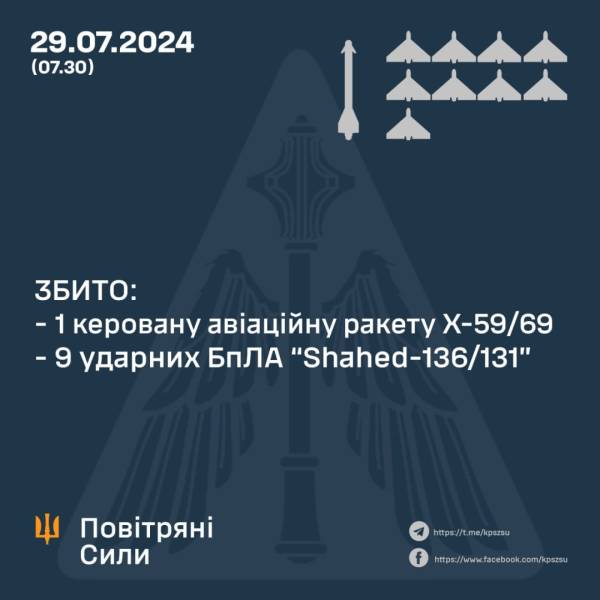 У результаті протиповітряного бою збито керовану авіаційну ракету Х-59/Х-69 та дев’ять БпЛА «Shahed-131/136». Повітряні цілі знищено у Дніпропетровській, Херсонській та Кіровоградській областях.