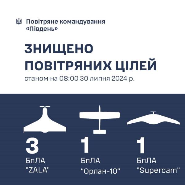 Зокрема, зазначається, що станом на 9.00 Повітряні сили ЗСУ знищили 4 БпЛА Zala, 2 БпЛА «Орлан-10» та 1 Supercam.