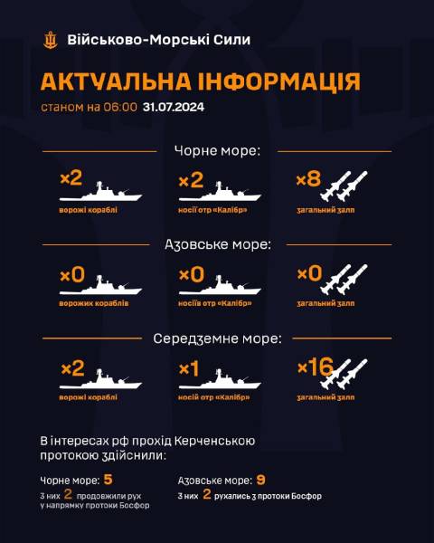 В Азовському морі ворожі кораблі відсутні. У Середземному морі два ворожі кораблі, з яких один є носієм крилатих ракет “Калібр” загальним залпом до 16 ракет.