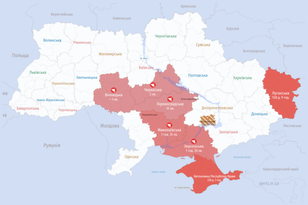 Станом на 5 годину ранку мапа повітряних тривог виглядає так: