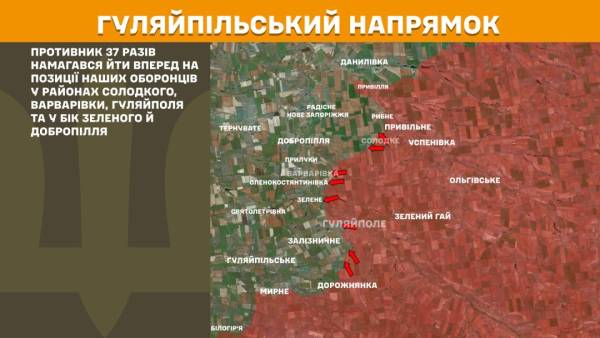 На Гуляйпільському напрямку ворог 37 разів робив спроби йти вперед в районах Солодкого, Варварівки, Гуляйполя та в напрямку Зеленого й Добропілля.
