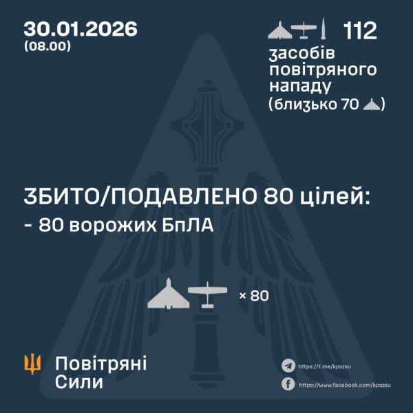 ППО з вечора знешкодила 80 зі 111 російських дронів 30.01.2026 08:13 Укрінформ Протиповітряна оборона знищила 80 безпілотних літальних апаратів, котрі російська армія використала для атаки на Україну з минулого вечора. На декількох об’єктах зафіксовані попадання балістичної ракети та 25 ударних БпЛА супротивника.
