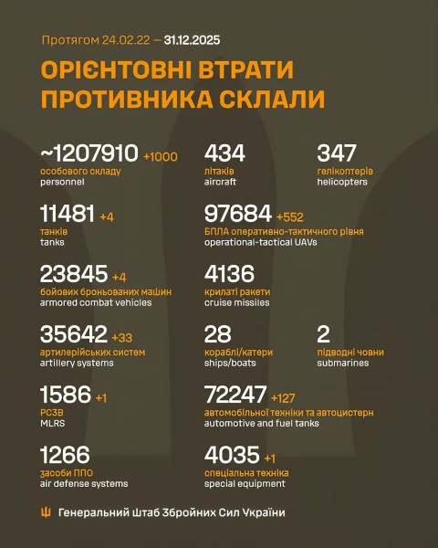 Битва за Україну. День тисяча чотириста сьомий 31.12.2025 20:00 Укрінформ Сили оборони вразили Туапсинський НПЗ, нафтогазовий термінал «Таманьнєфтєгаз», нафтобазу Росрезерву та ряд інших об’єктів російських окупантів Ми зібрали для вас інформацію про тисячу чотириста сьомий день Великої війни: як жили Україна та українці 31 грудня 2025 року.