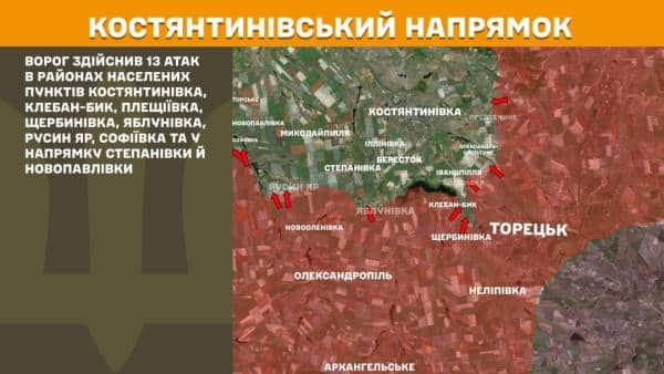 На Костянтинівському напрямку окупаційні війська здійснили 13 атак в районах Костянтинівки, Клебана-Бика, Плещіївки, Щербинівки, Яблунівки, Русиного Яру та Софіївки, у напрямку Степанівки й Новопавлівки.