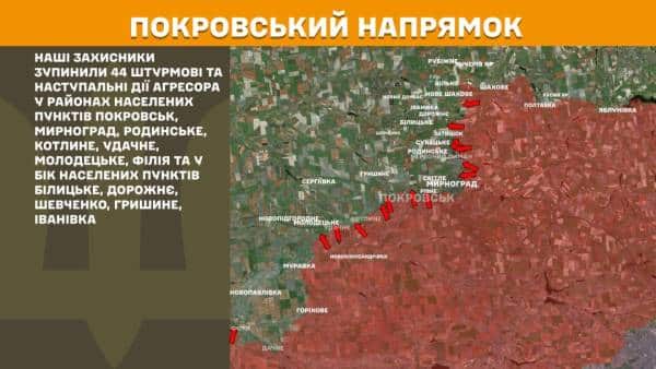 На Покровському напрямку українські захисники зупинили 44 штурмові та наступальні дії противника в районах Покровська, Мирнограда, Родинського, Котлиного, Удачного, Молодецького та Філії, у бік Білицького, Дорожнього, Шевченка, Гришиного й Іванівки.