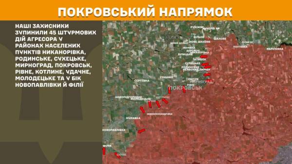 На Покровському напрямку українські воїни відбили 45 штурмових спроб противника в районах Никанорівки, Родинського, Сухецького, Мирнограда, Покровська, Рівного, Котлиного, Удачного та Молодецького, у напрямку Новопавлівки та Філії.