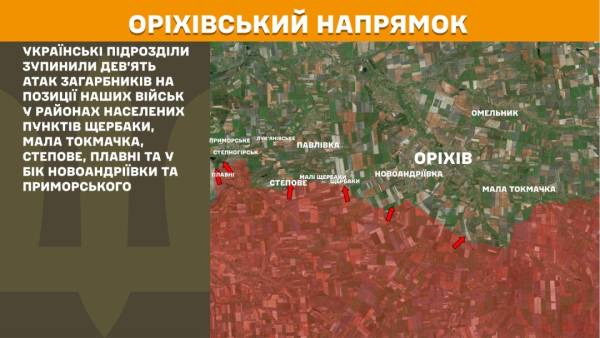 На Оріхівському напрямку українські підрозділи зупинили дев’ять атак загарбників у районах Щербаків, Малої Токмачки, Степового, Плавнів та у напрямку Новоандріївки та Приморського.