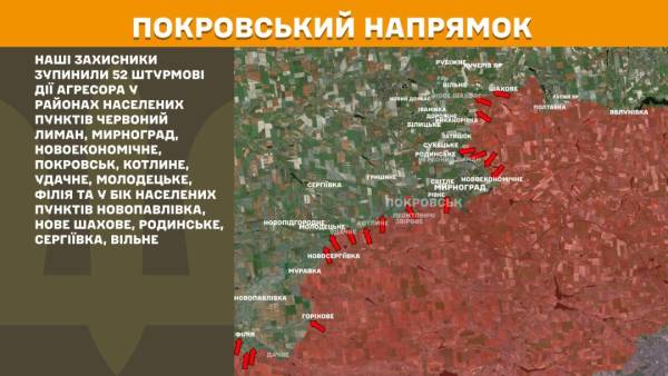 На Покровському напрямку захисники України зупинили 52 штурмові дії агресора у районах Червоного Лимана, Мирнограда, Новоекономічного, Покровська, Котлиного, Удачного, Молодецького, Філії та у напрямку Новопавлівки, Нового Шахового, Родинського, Сергіївки, Вільного.
