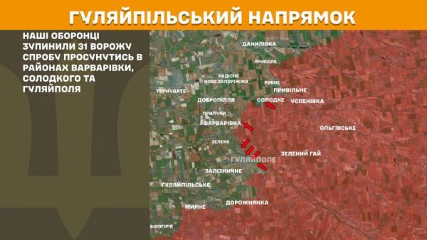 На Гуляйпільському напрямку Сили оборони зупинили 31 ворожу спробу просунутись в районах Варварівки, Солодкого та Гуляйполя.