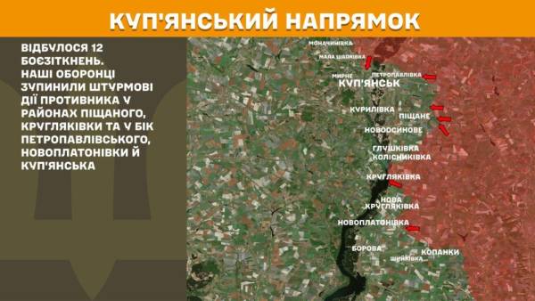 На Куп’янському напрямку відбулося 12 бойових зіткнень. Сили оборони стримали штурмові дії росіян в районах Піщаного, Кругляківки та у напрямку Петропавлівського, Новоплатонівки й Куп’янська.