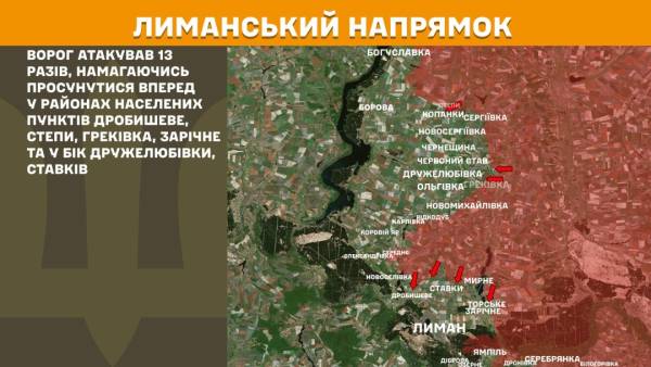 На Лиманському напрямку противник атакував 13 разів, намагаючись просунутися вперед в районах Дробишевого, Степів, Греківки, Зарічного та в напрямку Дружелюбівки, Ставків.