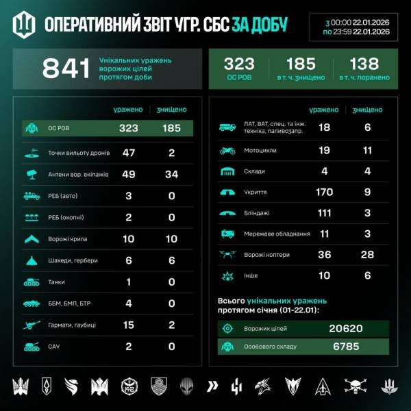 У цілому з 1 по 22 січня підрозділи СБС знищили та вразили 20620 цілей, з них – 6785 особового складу росіян.