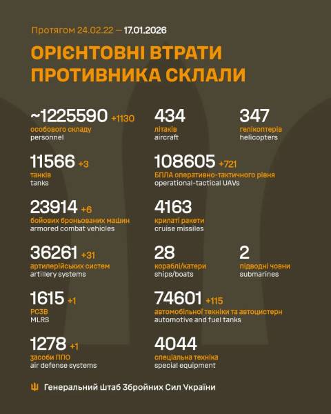 Російська армія за добу втратила на війні проти України 1130 окупантів Інфографіка 17.01.2026 07:30 Укрінформ Сукупні бойові втрати російських військ з моменту повномасштабного вторгнення в Україну, з 24 лютого 2022 року по 17 січня 2026 року, складають приблизно 1 225 590 осіб, зокрема 1130 осіб – за останню добу.