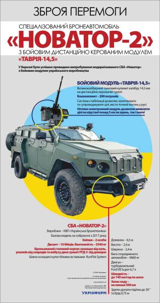 Зброя перемоги: спеціалізований бронеавтомобіль «Новатор-2» з бойовим дистанційно керованим модулем «Таврія-14,5» 14.03.2024 14:20 Укрінформ У березні було успішно проведено випробування модернізованого СБА «Новатор» з бойовим модулем українського виробництва