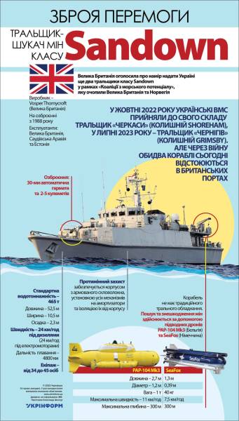 Зброя перемоги: тральщик-шукач мін класу Sandown 14.12.2023 10:05 Укрінформ Велика Британія оголосила про намір надати Україні ще два тральщики класу Sandown у рамках «Коаліції з морського потенціалу», яку очолили Велика Британія та Норвегія