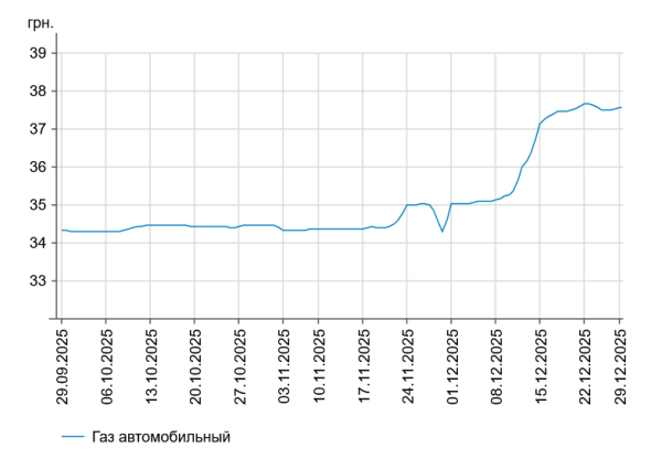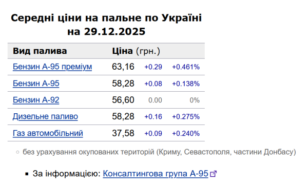 Зокрема, зафіксовано такі середні показники на пальне: бензин марки А-95 (преміум) – 63,16 грн/л (подорожчав на 29 коп.); бензин марки А-95 – 58,28 грн/л (подорожчав на 8 коп.); бензин марки А-92 – 56,6 грн/л; дизельне пальне – 58,28 грн/л (подорожчало на 16 коп.). Середня вартість автогазу складає 37,58 грн/л, що на 9 коп. більше, якщо порівнювати з попереднім робочим днем – 26 грудня.