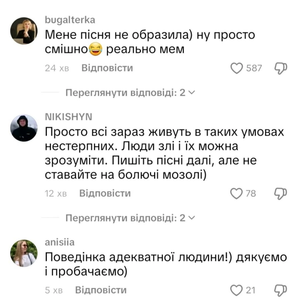Я мала намір фрагментом композиції об’єднати всіх, а об’єднала всіх проти себе. З’явився такий мем. Нічого, пробачте мені, будь ласка, хоч і неприємний для мене мем