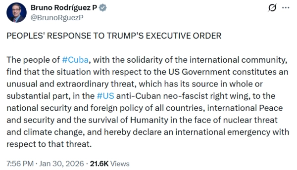 Згідно із заявою дипломата, кубинський народ, спираючись на підтримку міжнародної спільноти, вважає, що ситуація відносно американського уряду становить “незвичайну та надзвичайну загрозу, яка цілком або здебільшого походить від антикубинського неофашистського правого крила США”.