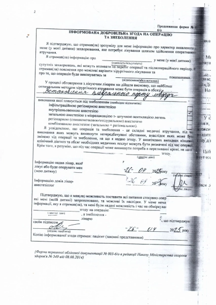 Дозвіл на проведення конкретного типу анестезії, документ редакції УНН надала Ольга Мелай
