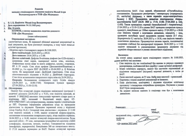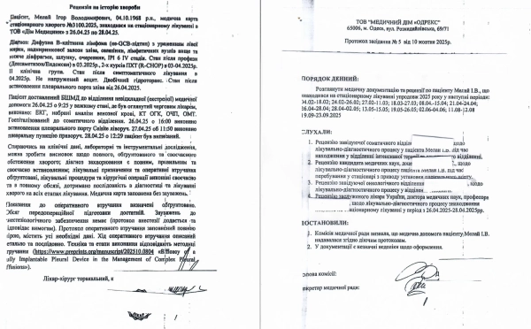 Окремий масив паперів, котрі викликають питання у вдови – це рецензії та протокол медичної ради Odrex, датовані жовтнем 2025 року, тобто вже після кончини пацієнта. У даних документах клініка робить висновок, що медична допомога надавалася відповідно до клінічних протоколів, а всі зафіксовані недоліки зводяться до “незначних помилок оформлення”.