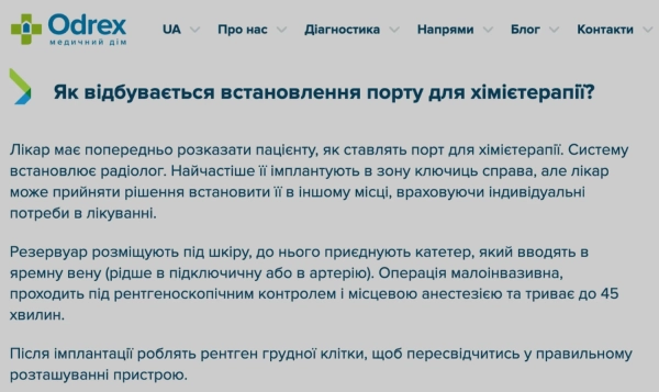 Знімок екрана з вебсайту лікарні “Одрекс”