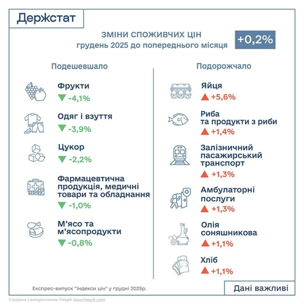 У грудні 2025 року споживча інфляція в Україні зменшилася до 8% у річному обчисленні. Вартість харчових продуктів і безалкогольних питних виробів залишилася без змін, у той час як транспортні витрати зросли на 0,7%.