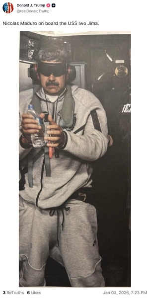 Дональд Трамп оприлюднив світлину Ніколаса Мадуро на палубі авіаносця USS Iwo Jima після його арешту американськими силами спеціального призначення. Мадуро постане перед американським правосуддям за обвинуваченнями у наркотичному тероризмі та нелегальній торгівлі зброєю.